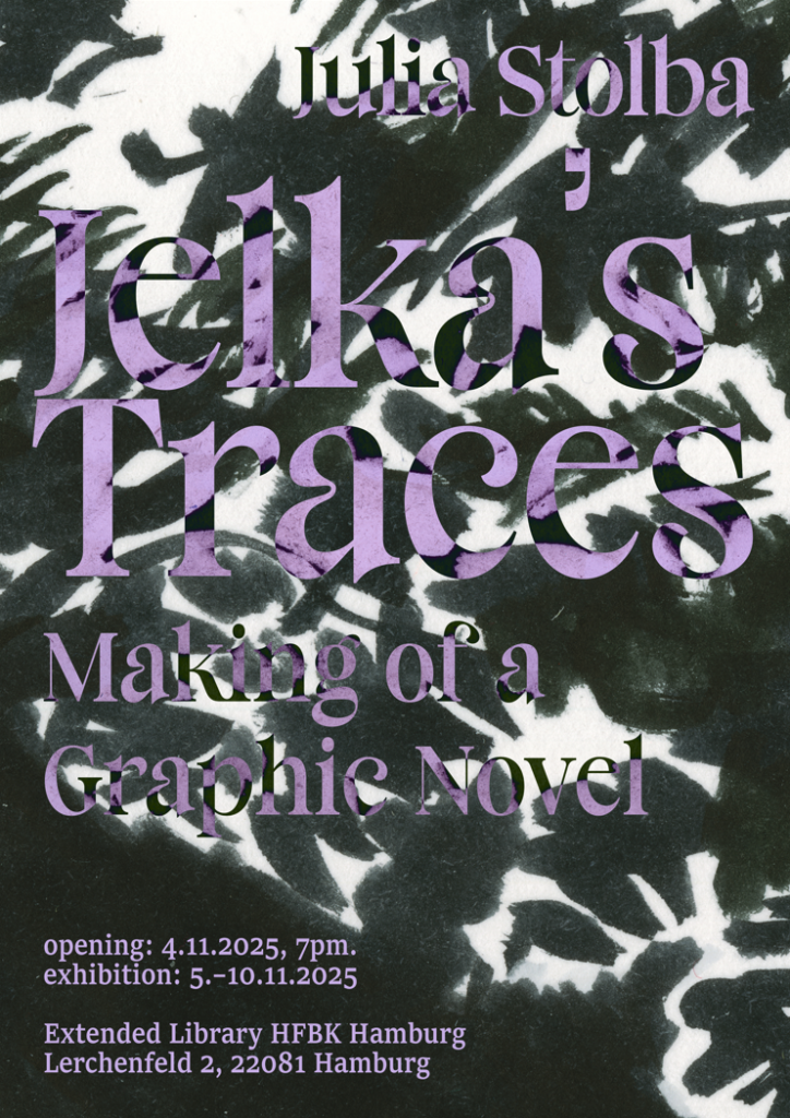 The exhibition Jelka’s Traces. Making of a Graphic Novel is the artistic part of Julia Stolba’s doctoral thesis ‘The Dissociative Archive. Of Partisans, Ghosts and Affects in the Peršmanhof Museum’ at the HFBK Hamburg. It shows the process of creating the graphic novel and the archival work within the project.